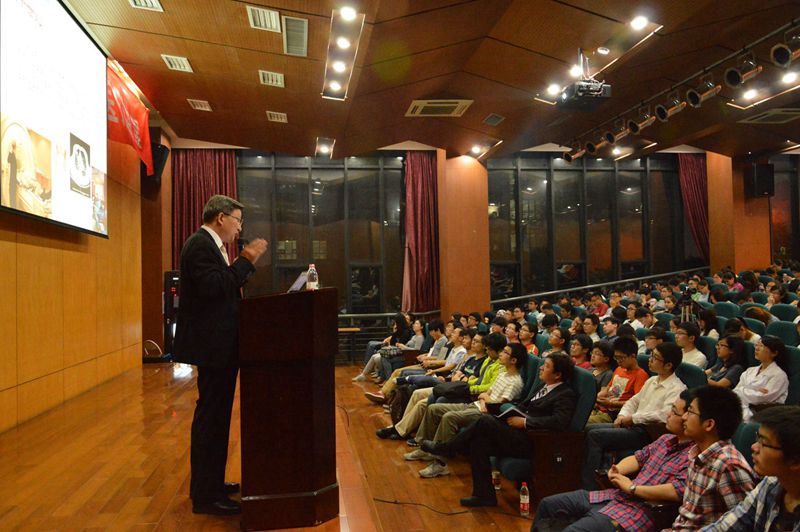 宣誓仪式后是邵逸夫医院蔡秀军院长的创新与外科发展讲座。蔡秀军院长首先围绕外科学的发展史,向我们介绍了外科进步的重重里程碑,从解剖学的出现到止血术的成熟,从巨创手术到现在的微创手术,外科经历了七个世纪的风雨走到今天,不仅外科的格局发生了改变,整个医学模式也在不断地更新变化。现代医学正处于从生物医学向生物-心理-社会医学模式转变的时期,新的医学模式也造就了新的医患关系模型。想要在新医学模式下治疗疾病又减少机体心理与生理的创伤,微创外科的出现恰好能够满足这一追求。随后蔡秀军院长向大家介绍微创外科的发展与进步,结合自身的研究与发现,展示了邵逸夫医院在此领域的先进技术。同学们被蔡秀军院长的精彩讲说所深深吸引,无不为蔡秀军院长和邵院的成就所震撼。蔡秀军院长寄语:不要走他人已经走过的路,因为道路只能引导你到达他人能到的地方。讲座结束后,叶旭军书记向蔡秀军院长赠送名医名师大讲堂纪念牌以示感谢。