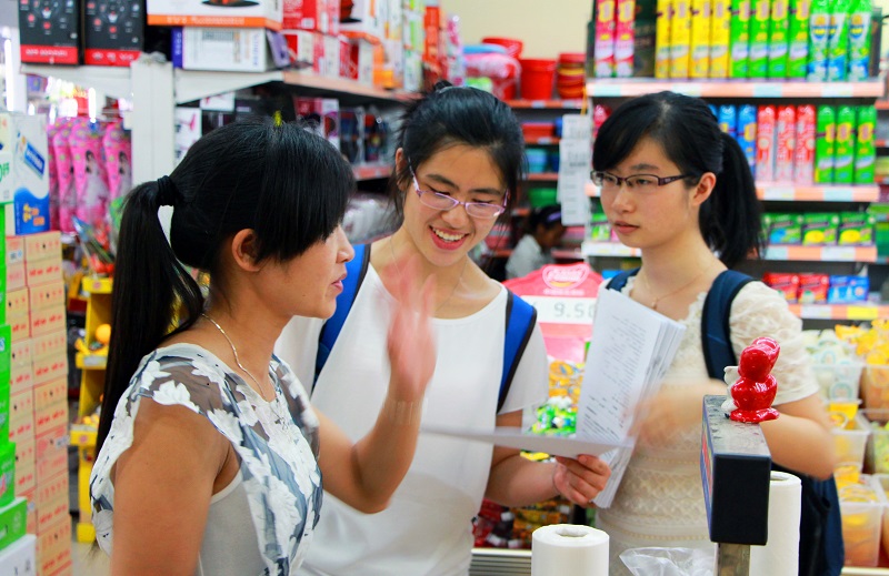 第二天,大二的同学便开始一天在烈日下的调研了。以镇政府为中心,每两人为一组,向两边的街道扫街调查。大家主要通过两种方式调查:口头询问与直接填写。对于填写有困难的人员,队员一题题地把问卷读给他们听,再根据他们的回答如实填写;对于有文化、有意愿的被调查人员,将问卷留给他们填写,一定时间后回收。早上的调研在大家的努力下异常顺利,一个上午便收集了大约三四十份问卷。