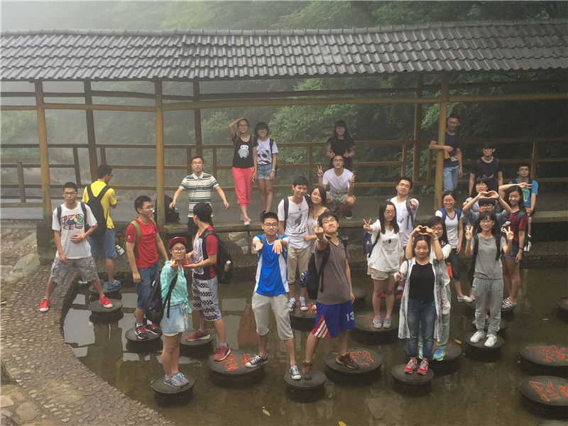 愉快的野炊结束了,大家带着充沛的精力向天目山进军。一路上山,一路伴着分级而下的瀑布,凉爽的空气使大家感到心旷神怡。拾级而上,迎面见到绿绿的水面上有悬吊的木桥,同学们纷纷尝试着过桥,桥紧紧贴在水面上,过每一节时都伴随着整个铁索的摇晃,只得紧紧抓住铁索,还是颇费了一番体力,但是大家都玩得非常开心。爬到半山腰,同学们感到有些累了便坐下休息,大家一边聊天,一边把自己带的零食与别人分享。刘程同学拿出埙,为大家吹奏了几曲,颇具商周之精神气质,把大家的思绪带向悠远的历史。休息好之后大家继续前进,饱览着天目山的奇岩怪石,流泉飞瀑,一路登顶,竟也忘记了疲惫,只剩下满眼的美景和愉快的心情。