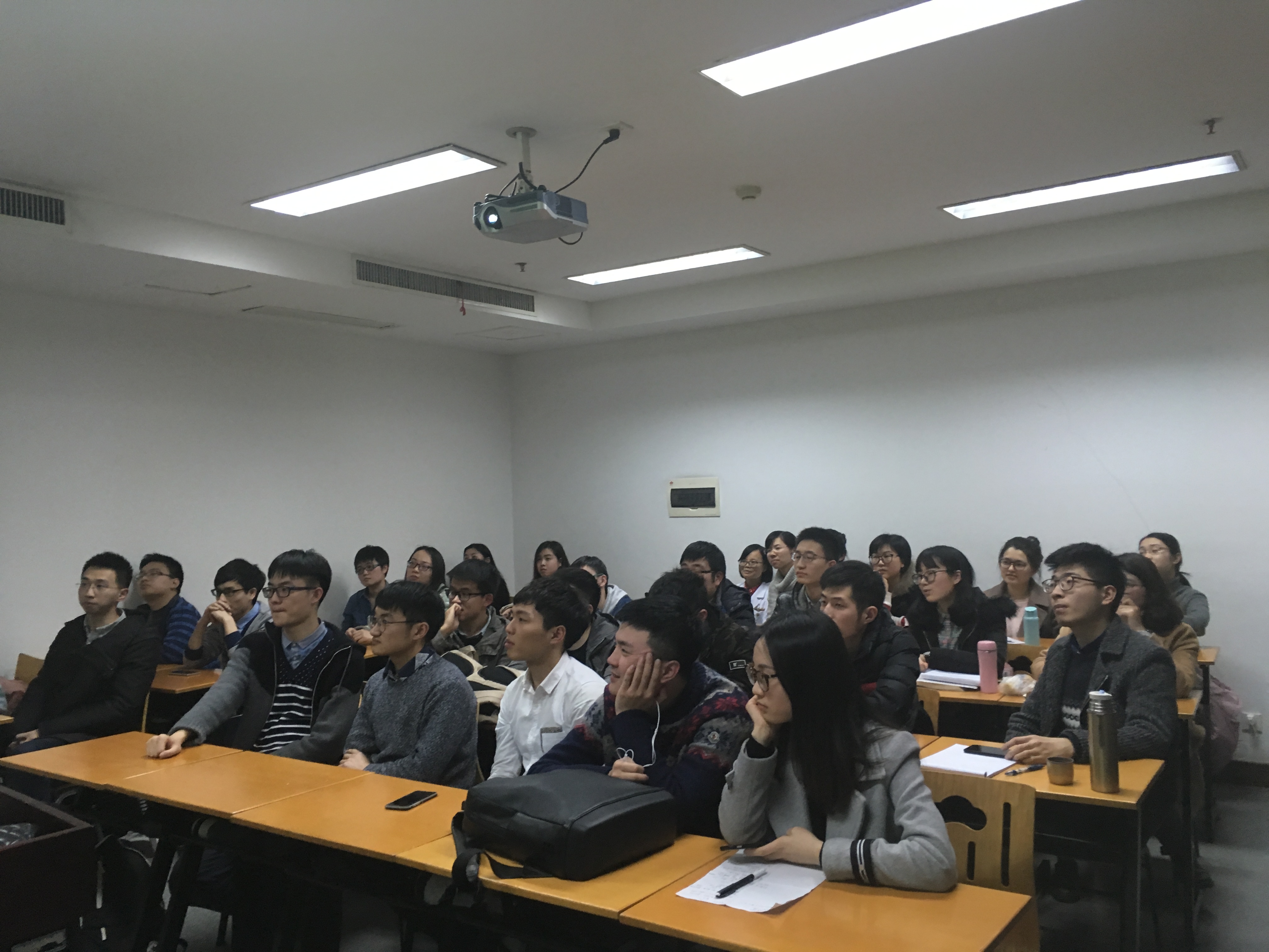 让同学们惊喜的是,张丹老师还邀请到了浙大附属邵逸夫医院心内科盛夏主任。盛夏老师为同学们介绍了心内科各级学科的特点和前景及其学位点招生情况,告诉同学们心内科老师对学生的要求,他还说:“心内科虽然忙,但很充实,有兴趣的同学都能在这儿找到成就感。”虽然事后知道盛夏老师是刚出导管室就来见同学们了,但言语间不难看出盛老师对工作的热爱。最后,盛老师还回答了同学们就导管室辐射、心内科男女就业差异等方面的问题。张老师本来还邀请了肿瘤科的老师朱洪波主任/博导、泌尿外科的郑一春主任,遗憾的是郑主任接台手术到晚上9:00才结束,朱洪波主任虽然因为手术及科室临时有事没到现场,但也托张丹老师为同学们介绍肿瘤学位点的招生情况。