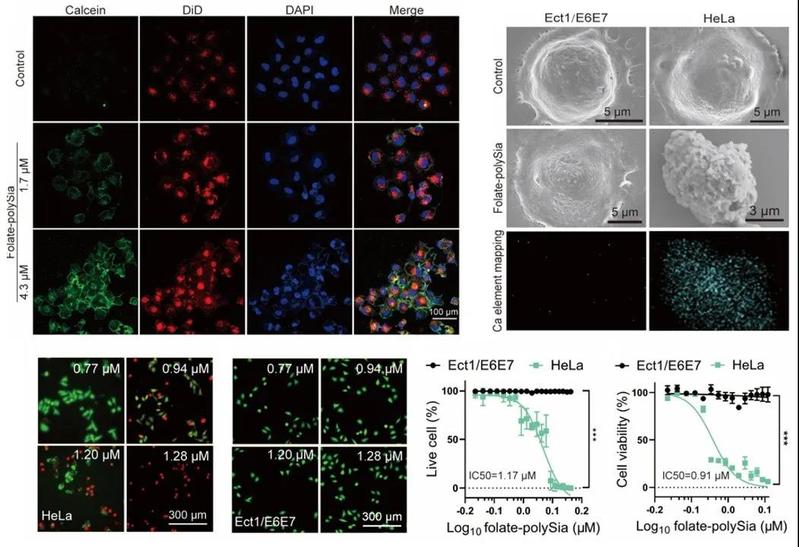 该分子由提供肿瘤细胞靶向性的叶酸分子和聚唾液酸高分子组成,其中的高分子链富含羧基,能够诱导体液中的钙离子的聚集。实验结果表明,该药物能诱导肿瘤细胞表面发生矿物沉积,形成一层壳状矿物结构,进而达到限制肿瘤细胞营养摄取和代谢的作用。正常细胞因叶酸受体表达较低,不能与药物发生结合,故而不受任何影响。