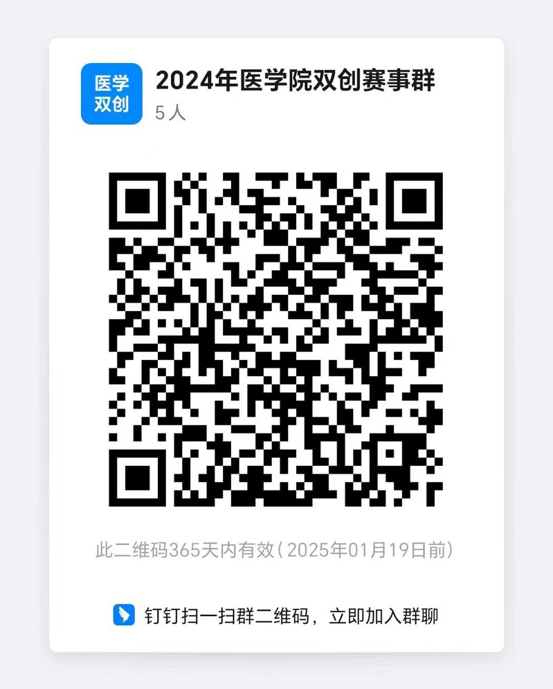 2.请医学院有意参赛的师生扫描下方二维码,加入浙大医学院2024年双创赛事群,填写附件6医学院推荐项目名单,并发送至魏老师zhinan.wei@zju.guoxinschool.com。学院会根据已有的技术和人员基础,帮助配齐赛事需求的各类人才,并安排相关指导。有任何赛事相关问题,可在群里询问。