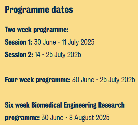 2025 年夏季,本次暑期学校将推出一项为期2、4、6 周的新课程。参加为期六周的生物医学工程研究计划的学生还可以在国王学院进行自己的生物医学工程研究项目。这是一个探索成为研究人员和解决现实生活问题的绝佳机会,同时为下一阶段的教育做好准备。在这六周的时间里,学生将从事与生物医学工程学院当前研究领域相一致的学术研究项目,进行实验以开发解决紧迫医学问题的解决方案。在该计划期间,学生将在St Thomas' Hospital 工作。